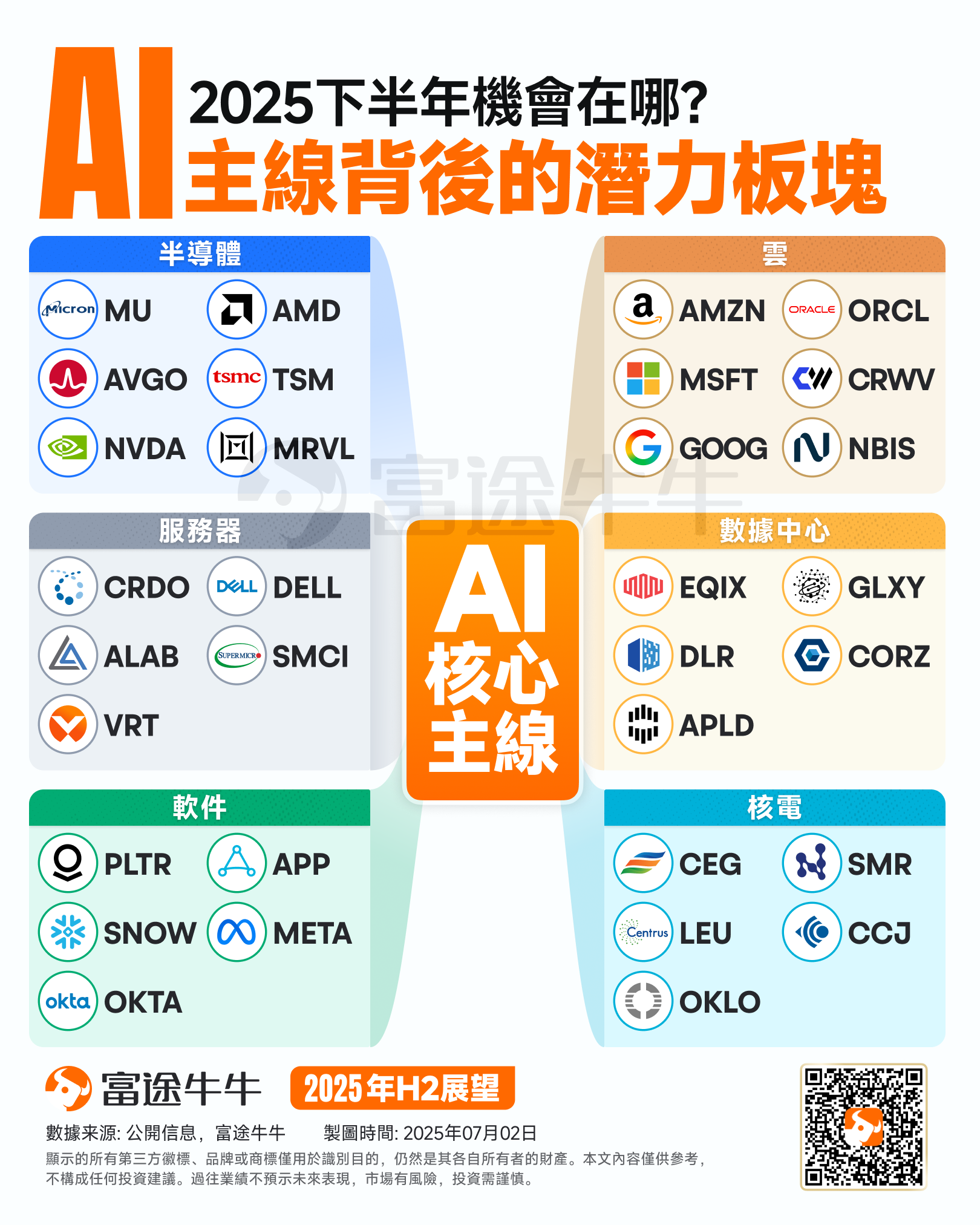 AI基础设施:随着AI应用和模型规模的持续增长,对算力和存储的需求将保持强劲,AMD在刚刚过去的6月Advancing AI大会上预计全球GPU营收将从2024年的450亿美元增至2028年的5000亿美元,复合增速60%。最直接受益的企业包括$英伟达 (NVDA.US)$、 $美国超微公司 (AMD.US)$ 、$博通 (AVGO.US)$、 $迈威尔科技 (MRVL.US)$ 和 $美光科技 (MU.US)$ 几家芯片设计商,以及在制造和COWOS先进封装环节近乎垄断的$台积电 (TSM.US)$。