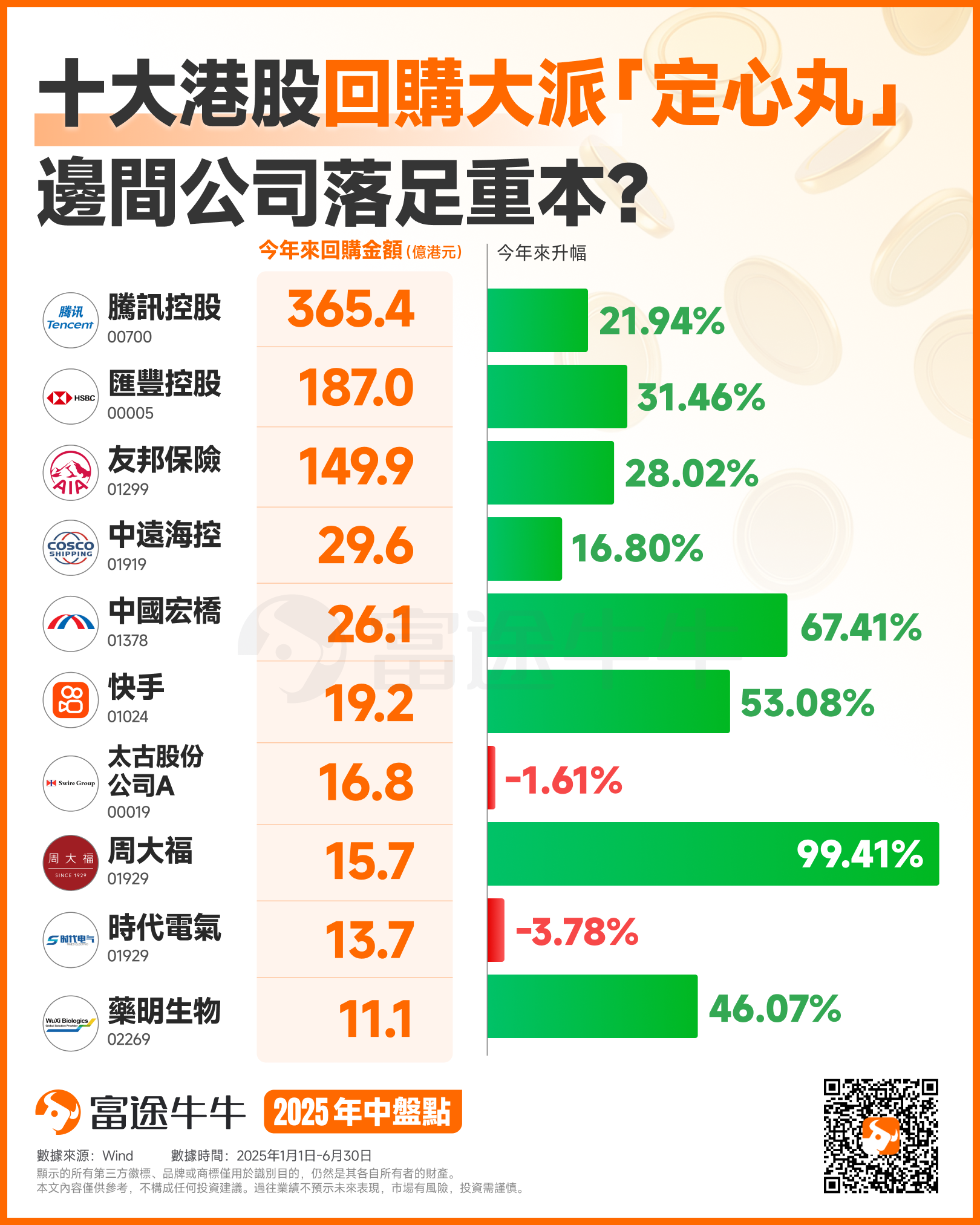 $汇丰控股 (00005.HK)$ 与 $友邦保险 (01299.HK)$ 紧随其后,分别以 187 亿港元、149.9 亿港元的回购额位列第二、第三。此外,$中远海控 (01919.HK)$ 、 $中国宏桥 (01378.HK)$ 、 $快手-W (01024.HK)$ 、 $太古股份公司A (00019.HK)$ 、 $周大福 (01929.HK)$ 、 $时代电气 (03898.HK)$ 、 $药明生物 (02269.HK)$ 等企业也跻身前十。