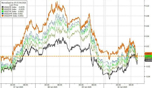 周四,从1年期至30年期——各期限美债收益率基本持平。当天早些时候公布的数据表明,上周初请失业金人数降至了近两个月低点,且目前尚无迹象表明特朗普的贸易战已导致私营部门出现大规模裁员。与此同时,美国股市均再度收高,标普500指数和纳斯达克综合指数双双进一步刷新了历史高位。
