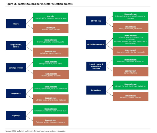 在上图中,瑞银展示了行业配置时考虑的关键变量、做出的决策,以及用于表达与这些变量相关的不同观点的行业类型 。瑞银强调可能影响行业特定表现的关键因素: