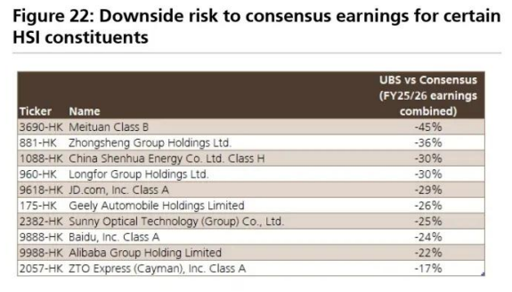 盈利修正:瑞银认为,由于外卖行业竞争加剧以及 2025 年下半年消费补贴的高基数效应,盈利存在下行风险。总体而言,分析师对恒生中国企业指数成分股 2025 年的盈利预测比共识低 4%;