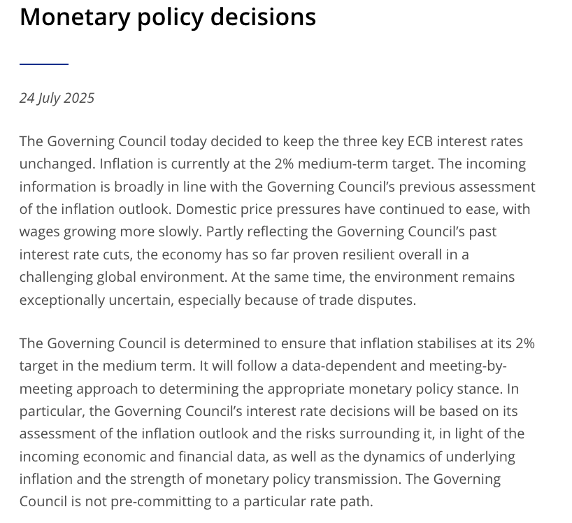 财联社7月24日讯(编辑 史正丞)北京时间周四晚间,欧洲央行如期宣布维持现有政策利率不变,后续动作也需要等待关税等一系列进展更加明朗。