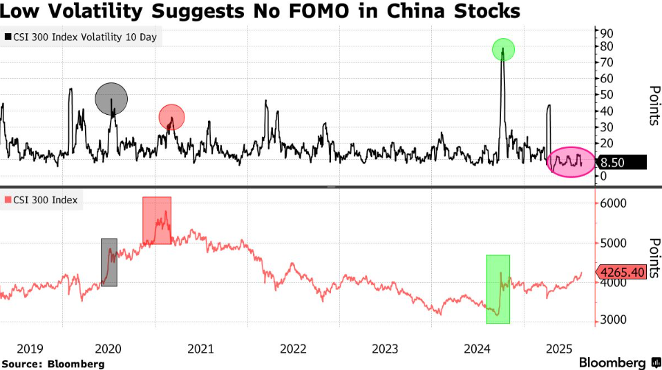 衡量市场波动率的沪深300指数10日历史波动率仅比今年低点高出几个点,远低于去年10月的高点。这一趋势让人对股市更可持续的上涨抱有希望,这可能有助于恢复投资者的信心。