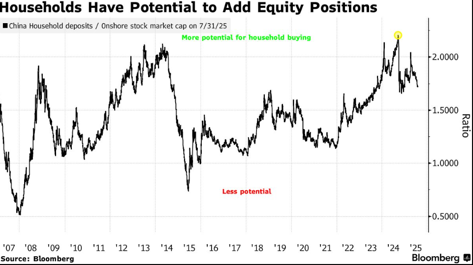 值得注意的是,本地投资者较以往更为谨慎。企业盈利前景等也尚未出现实质性好转。不过,持有创纪录储蓄的散户投资者仍是推动市场的潜在力量。分析师正密切关注居民储蓄规模(截至7月超过160万亿元人民币)与中国股市市值的比率,以评估居民可用于购买股票的潜在资金规模。