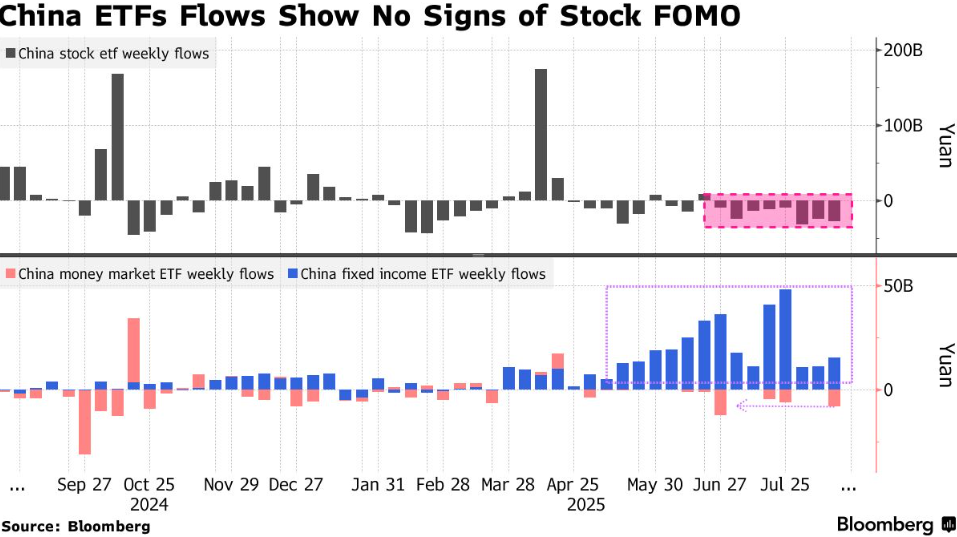 他们补充说,小额交易也表明散户参与度不高。一些家庭正转向股市寻求更高回报,但散户投资者尚未争相买入股票。彭博汇编数据显示,截至8月15日,以股票为主的中国交易所交易基金(ETF)已连续八周遭遇资金外流,尽管沪深300指数在此期间上涨逾9%。与此同时,固定收益ETF持续获得资金流入,货币市场基金赎回规模不大。