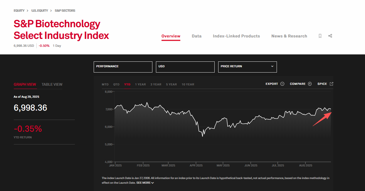 尽管上半年生物科技板块面临专利悬崖、药价政策压力、FDA审批放缓等多重挑战,SPSIBI指数表现整体弱于标普500指数,但8月以来多个成分股已显现强劲反弹势头。