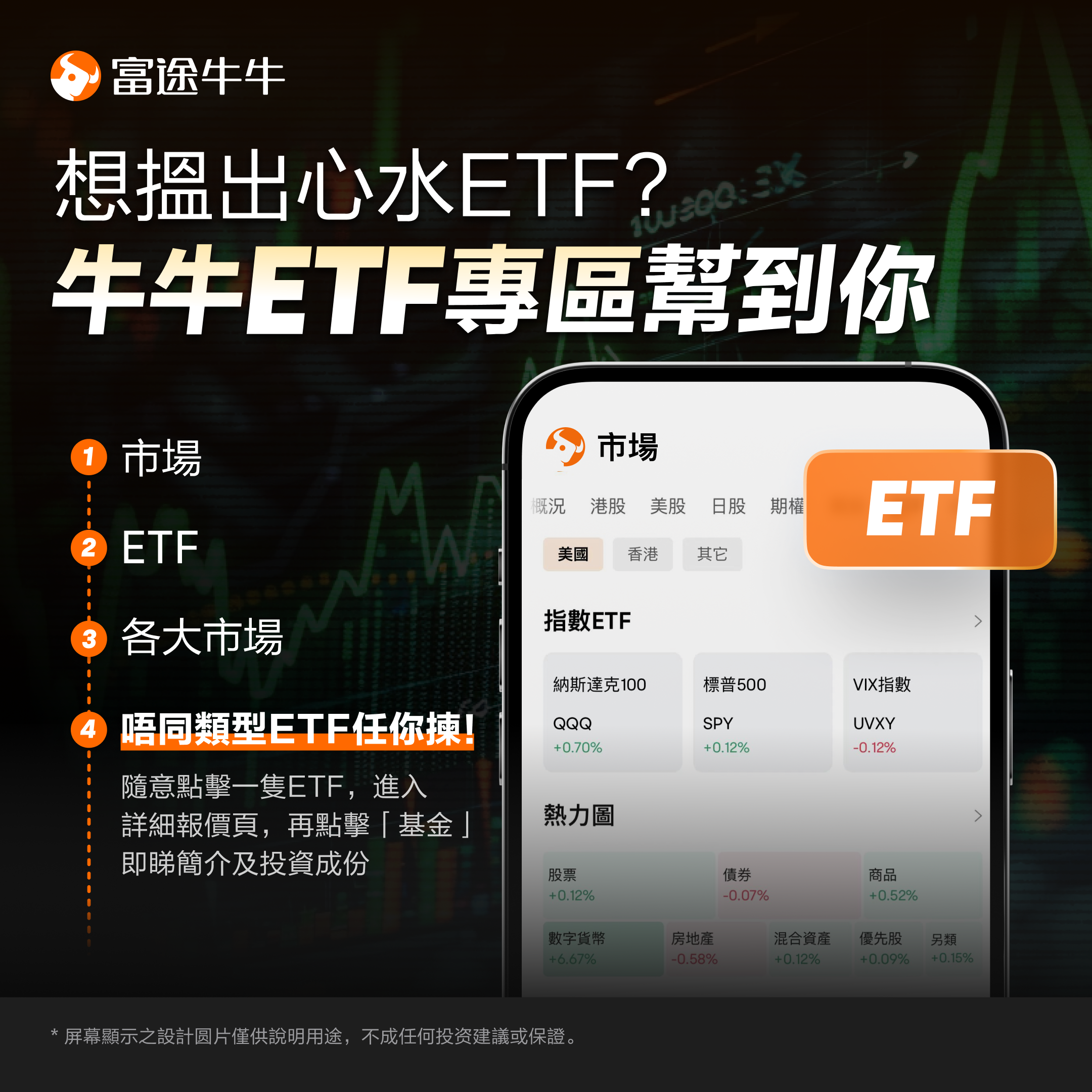 想找到心仪的ETF?牛牛美股ETF专区帮到你!打开市场>ETF>美国>不同类型ETF任你选!