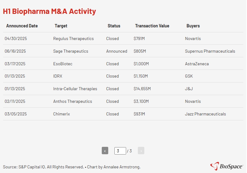 今年以来,全球生物制药市场继续保持了并购热潮。根据BioSpace统计,2025年上半年,全球发生32起医药并购,总金额超过480亿美元。多起重磅收购事件备受市场关注,例如, $强生 (JNJ.US)$ 以147亿美元收购Intra - Cellular Therapies、 $赛诺菲安万特 (SNY.US)$ 以99亿美元收购Blueprint Medicines、 $默沙东 (MRK.US)$ 以100亿美元收购$维罗纳制药 (VRNA.US)$等。