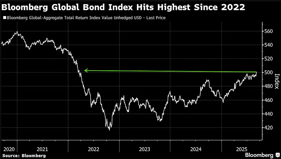 行情数据显示,随着固收市场全面回暖,追踪发达市场和新兴市场主权及公司债回报率的彭博全球综合债券指数已从2022年低点飙升了逾20%。这不仅刷新了2022年3月以来的最高水平,也正式宣告重返了技术性牛市区域。