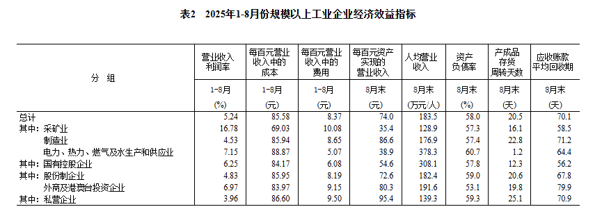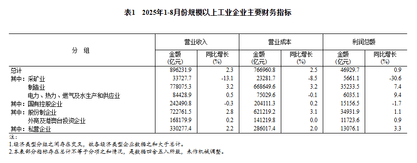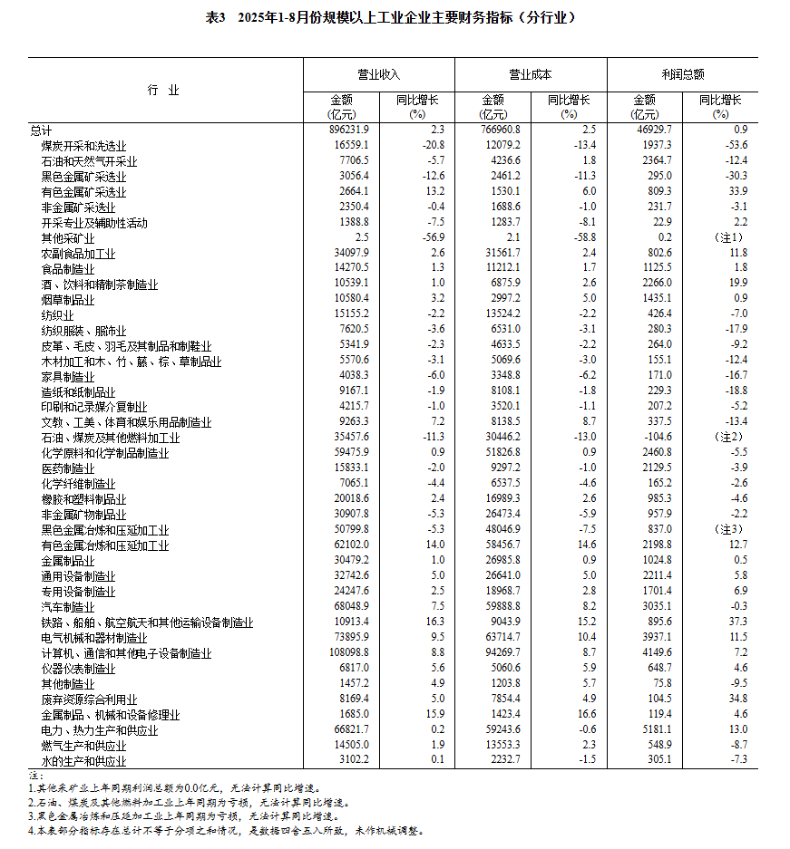 2025年1—8月份全国规模以上工业企业利润增长0.9%