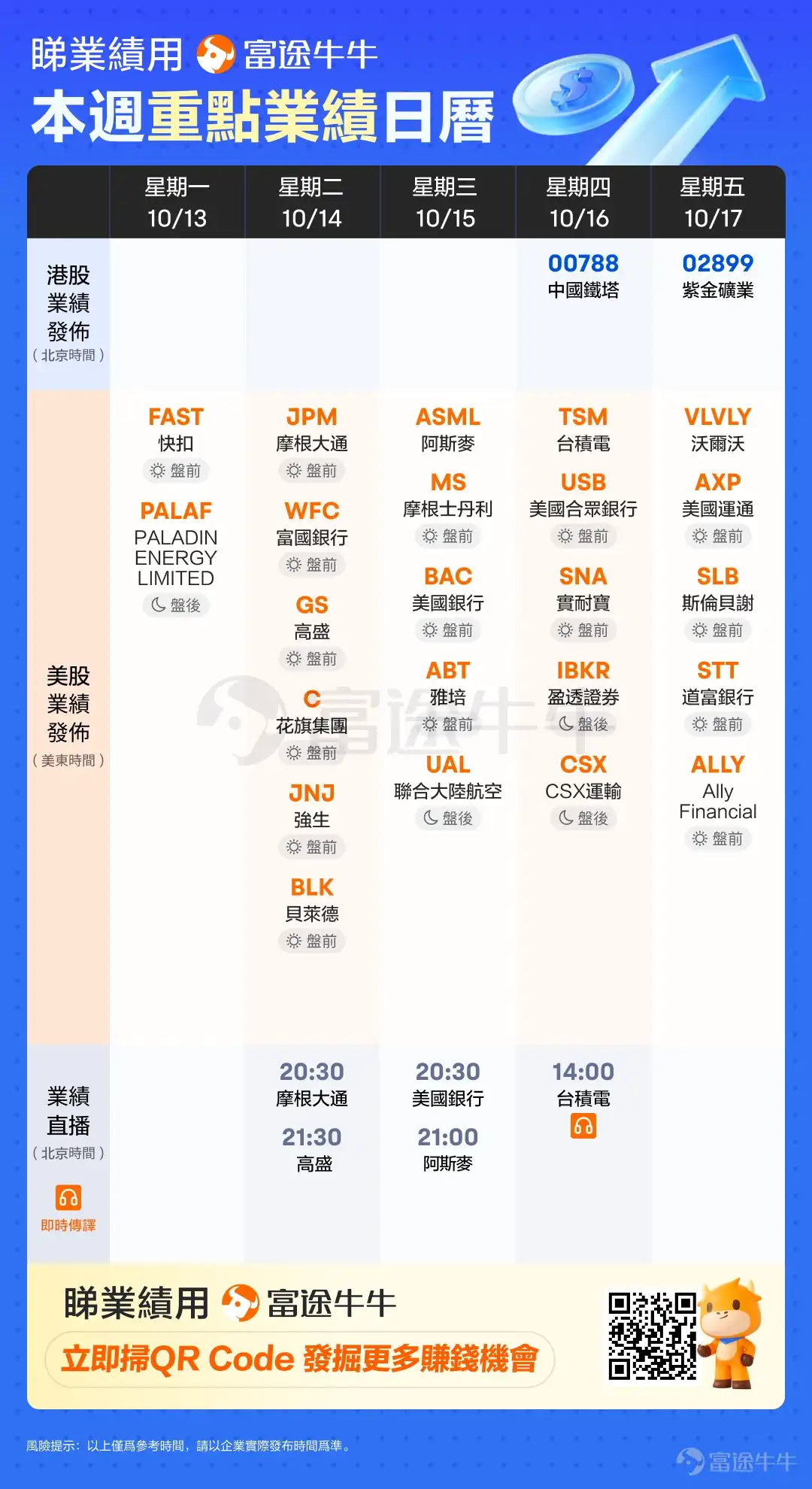 业绩方面, $美国运通 (AXP.US)$ 将于美股盘前发布业绩;港股 $紫金矿业 (02899.HK)$ 将于今日发布业绩。