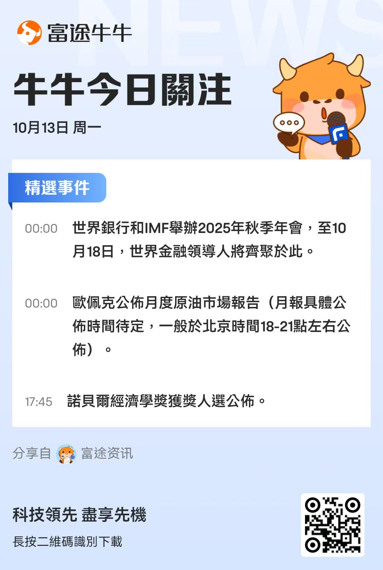 财经事件方面,世界银行和IMF举办2025年秋季年会,至10月18日,世界金融领导人将齐聚于此;英伟达开放计算项目2025全球峰会、甲骨文AI世界大会都将于周一揭幕。