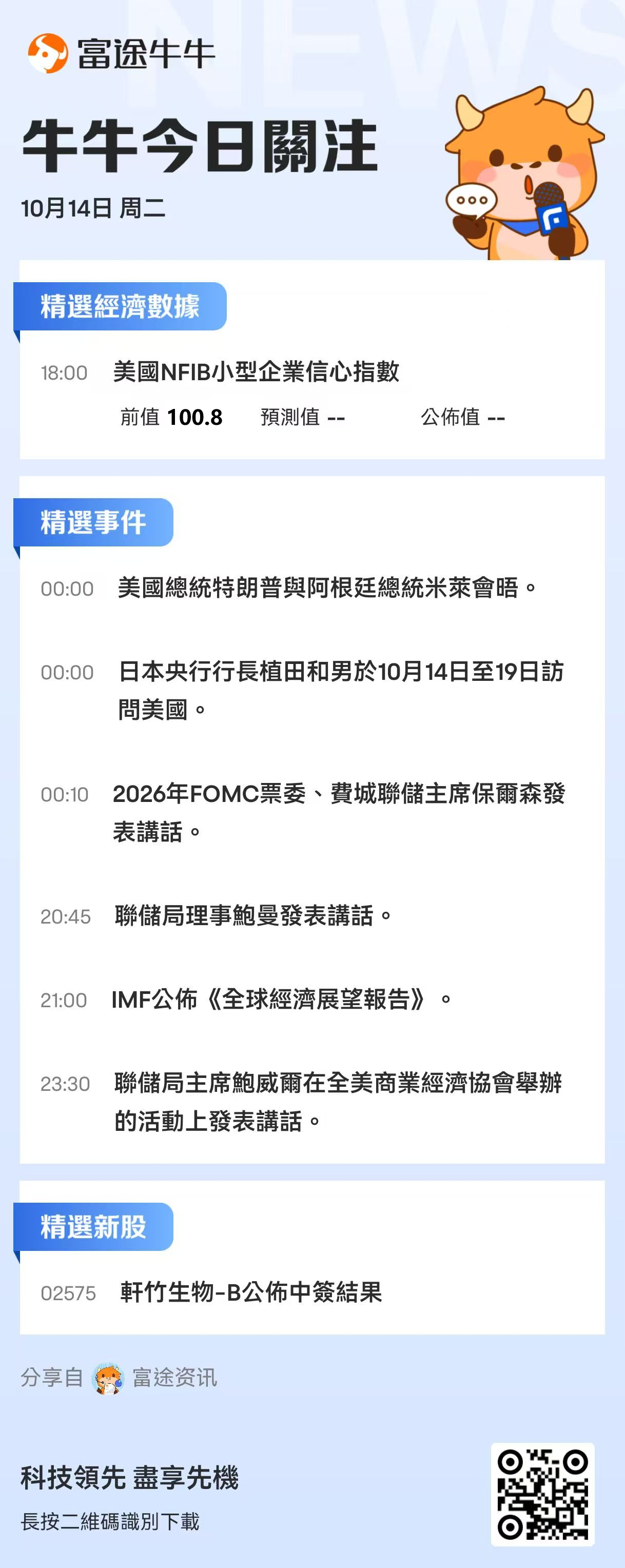 美国总统特朗普与阿根廷总统米莱会晤;日本央行行长植田和男将于10月14日至19日访问美国。