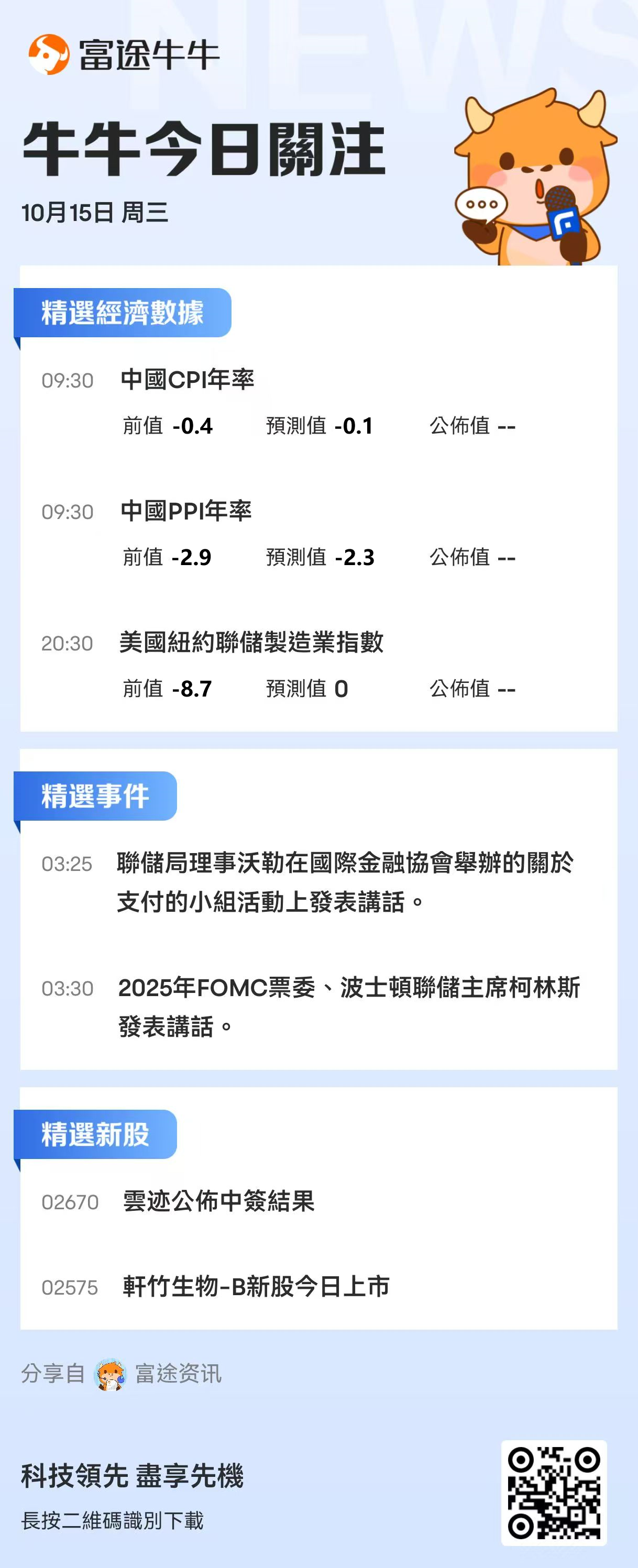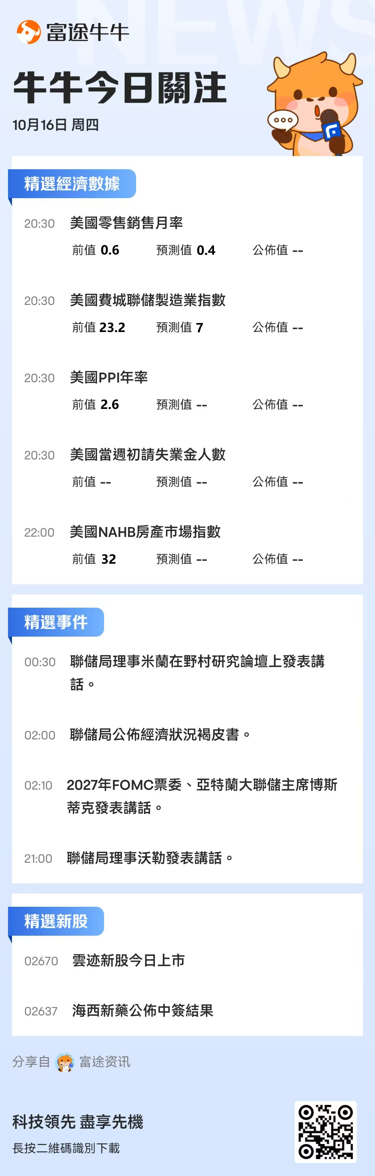 新股方面, $云迹 (02670.HK)$ 今日在港上市; $海西新药 (02637.HK)$ 公布中签结果。
