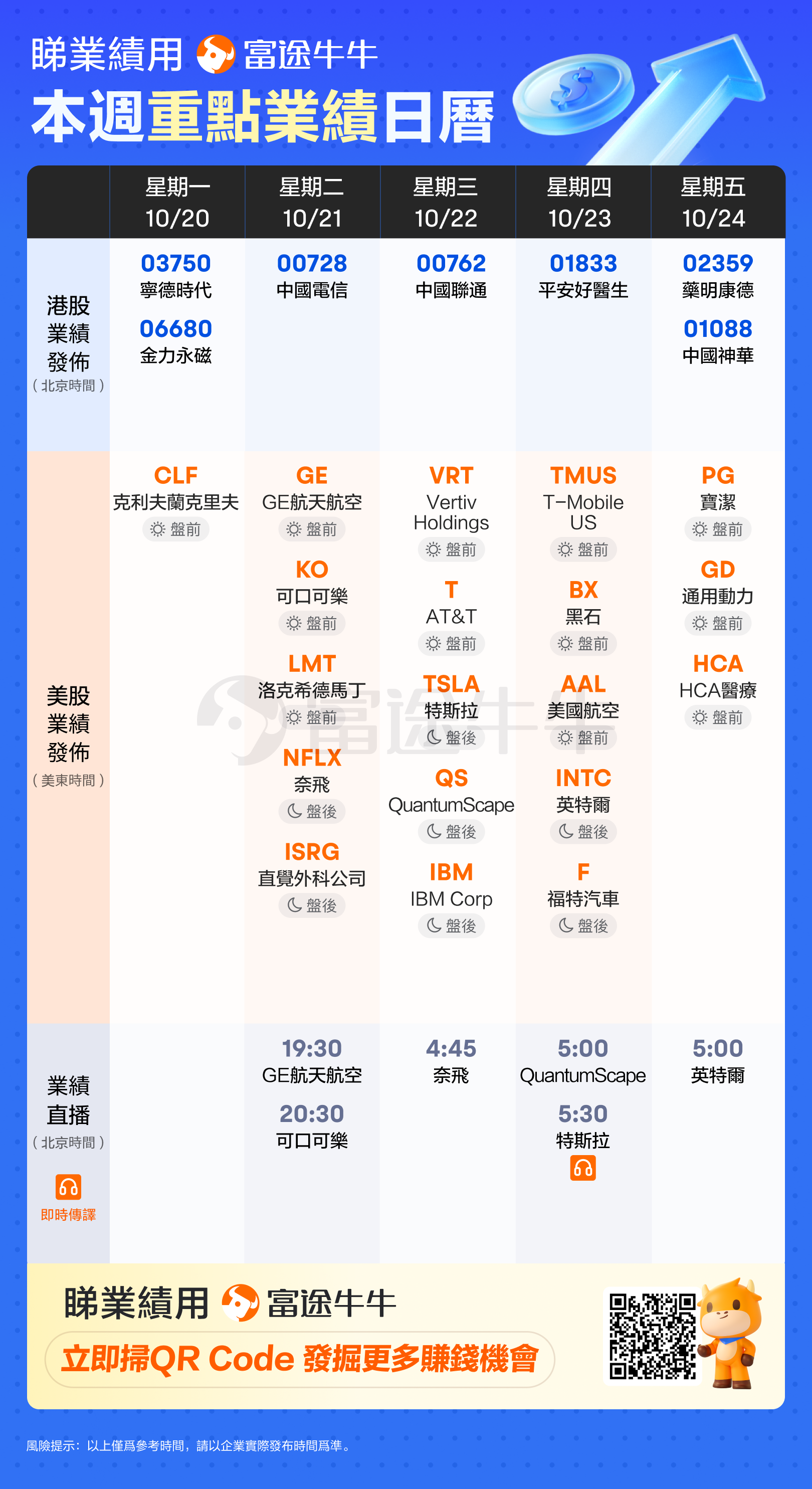 此外, $可口可乐 (KO.US)$ 、 $奈飞 (NFLX.US)$ 、 $宝洁 (PG.US)$ 、 $黑石 (BX.US)$ 多家公司最新财报将发布。港股方面, $宁德时代 (03750.HK)$、 $药明康德 (02359.HK)$、 $中国电信 (00728.HK)$ 、 $中国联通 (00762.HK)$ 、 $中国神华 (01088.HK)$ 等也将公布业绩。