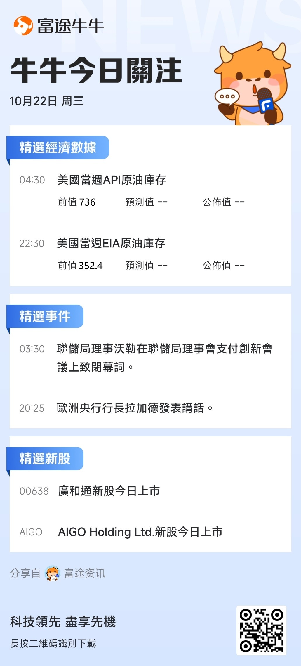 新股方面,$广和通 (00638.HK)$ 将于港股上市,跨境电商福州爱国者之星光电科技有限公司 $AIGO Holding Ltd. (AIGO.US)$将于美股上市。