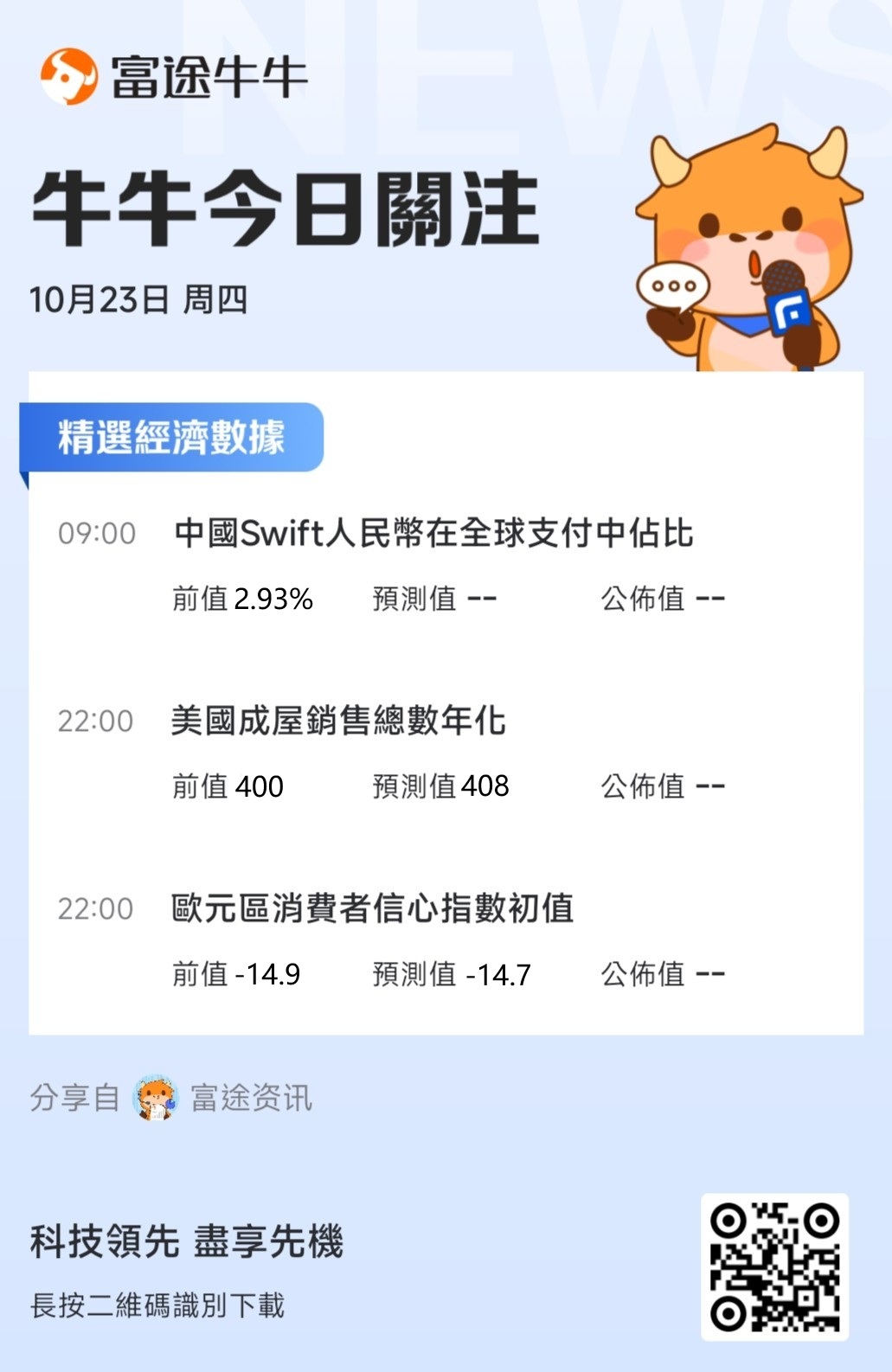 数据方面,美国9月未季调CPI年率、美国9月季调后CPI月率、美国10月标普全球制造业、服务业PMI初值、美国10月密歇根大学消费者信心指数终值等数据将出炉。