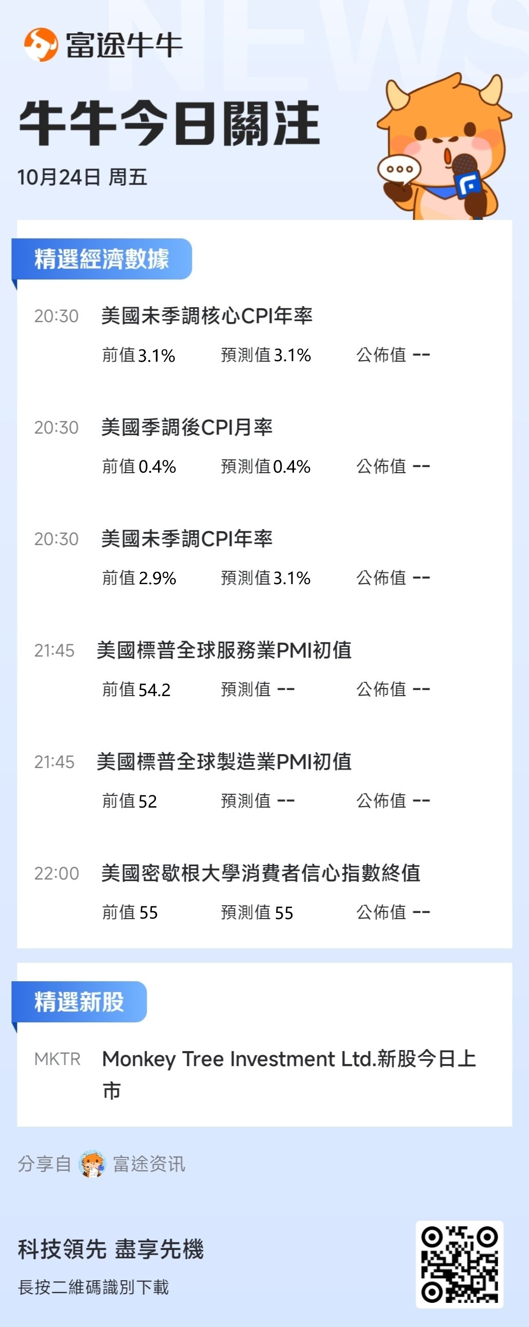 新股方面,香港少儿英语学习中心提供商 $Monkey Tree Investment Ltd. (MKTR.US)$ 将于美股上市。
