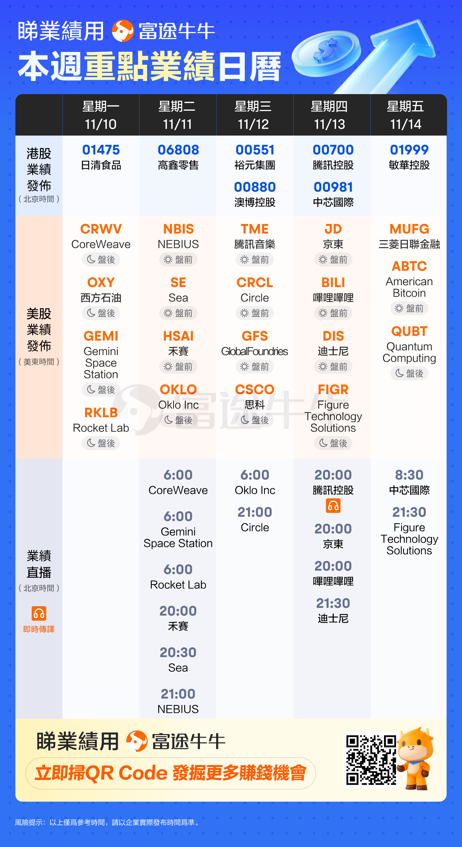 下周,$腾讯控股(00700.HK)$、$京东(JD.US)$、$哔哩哔哩(BILI.US)$、$中芯国际(00981.HK)$等将陆续披露美股或港股财报;同时,AI 算力新贵$CoreWeave(CRWV.US)$与$NEBIUS(NBIS.US)$、稳定币龙头$Circle(CRCL.US)$、量子计算公司$Quantum Computing(QUBT.US)$,以及$思科(CSCO.US)$、$西方石油(OXY.US)$、$迪士尼(DIS.US)$、$Quantum Computing(QUBT.US)$等美企也将公布业绩。