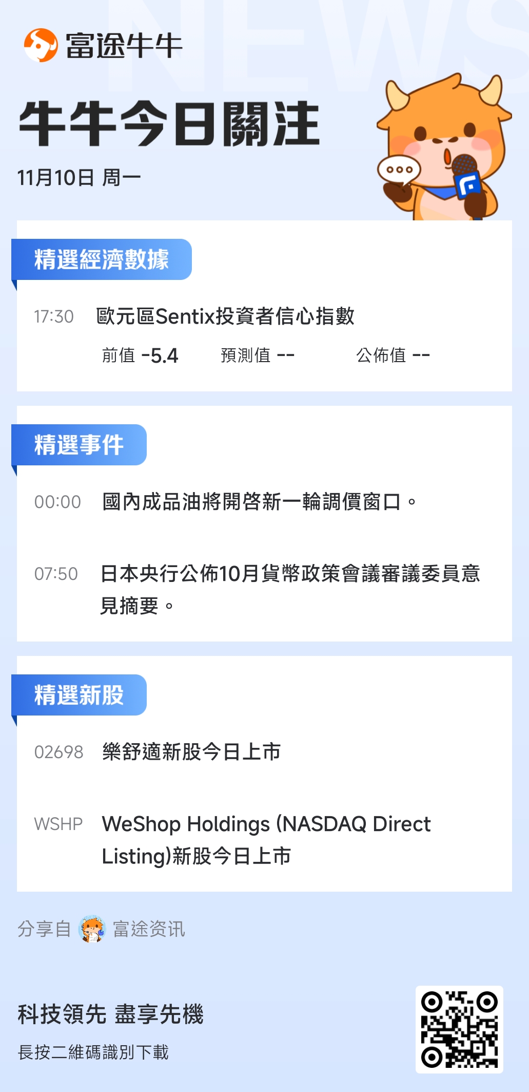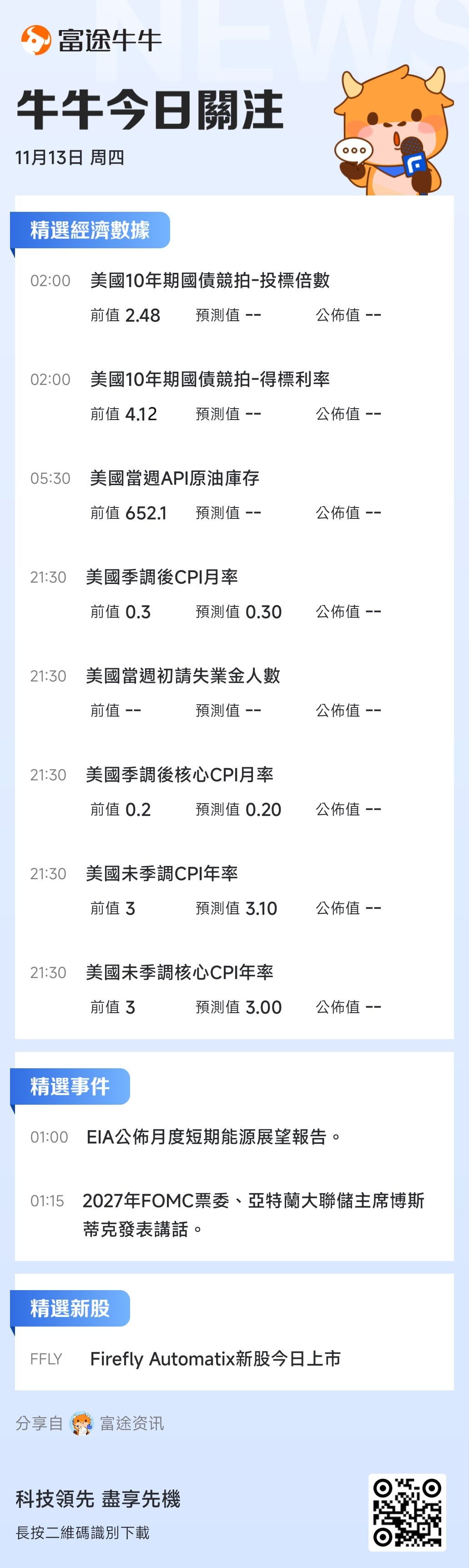 关键词:美国10月未季调CPI年率(待定)、美国10月季调后CPI月率(待定)、美国至11月8日当周初请失业金人数(待定)、博斯蒂克发表讲话、腾讯、中芯国际、京东业绩、Firefly Automatix美股上市。