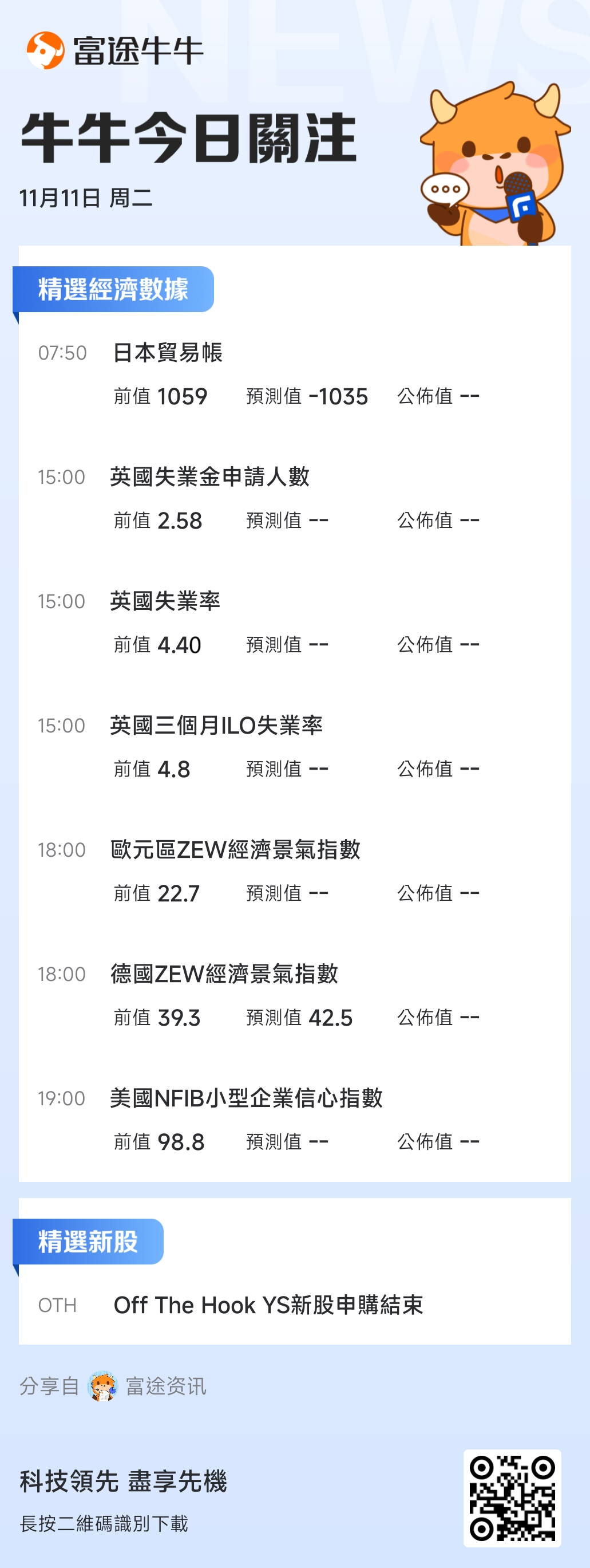 关键词:美国10月NFIB小型企业信心指数、Oklo、Sea、禾赛、NEBIUS业绩、新股Off The Hook YS申购结束。