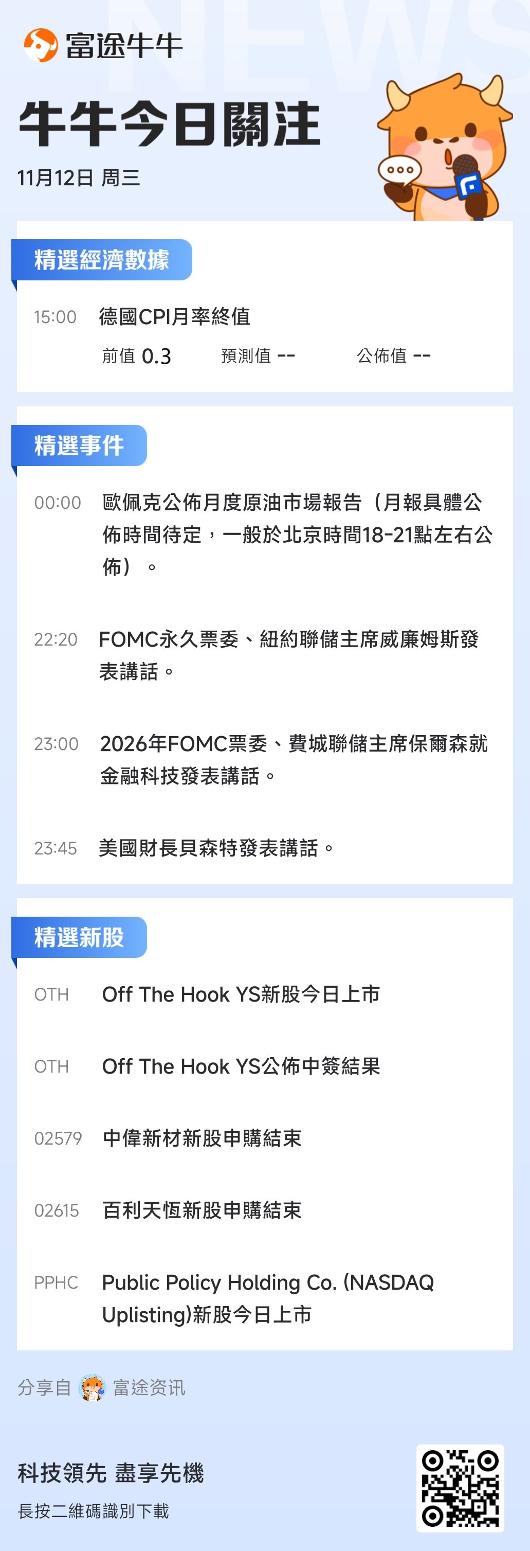 新股方面,美股$Off The Hook YS(OTH.US)$、$Public Policy Holding Co. (NASDAQ Uplisting)(PPHC.US)$今日上市,$中伟新材(02579.HK)$、$百利天恒(02615.HK)$申购结束。