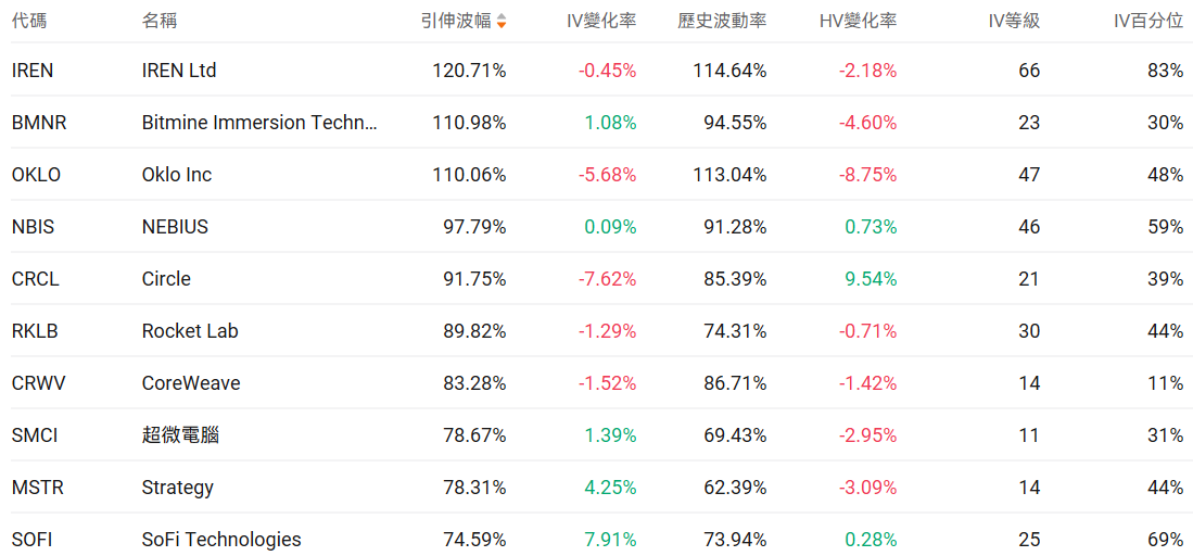 美股引申波动幅度排行榜前十(标的市值>100亿美元,且期权成交量>10万美元)