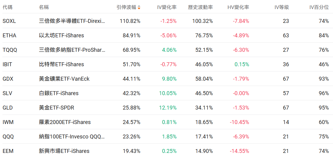 美股ETF引申波幅排行榜前十(标的要求:市值>100亿美元)