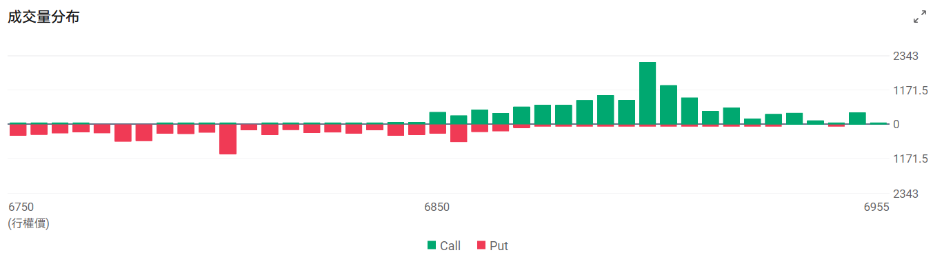 今日到期的 $标普500指数 (.SPX.US)$ 期权成交量分布:Call单与Put单分布存在分歧,Put单峰值在6800点,Call单峰值在6900点。