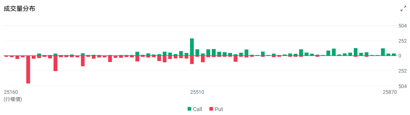 今日到期的 $纳斯达克100指数 (.NDX.US)$ 期权成交量分布:Call单峰值为25500,Put单峰值在25200点。