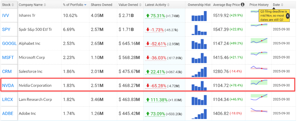 报告显示,截至9月30日,桥水持有 $英伟达 (NVDA.US)$ 251万股,较二季度末的723万股暴降65.3%。而在刚过去的第二季度,桥水才对英伟达持仓大幅加码逾 150%。两季度的急转弯,意味明显的策略转向:从“追随趋势”到“风险管理优先”。