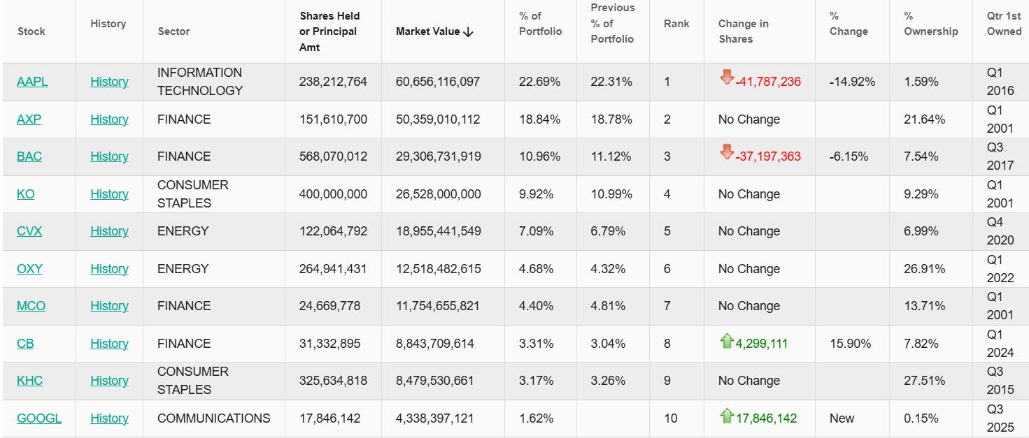 到三季度末,以持仓市值计,伯克希尔的十大重仓股大多数都是“老面孔”,唯一的新面孔就是 $谷歌-A (GOOGL.US)$ ,它挤掉了二季度排名第十的肾脏透析服务商$德维特 (DVA.US)$,后者三季度退居第11位。