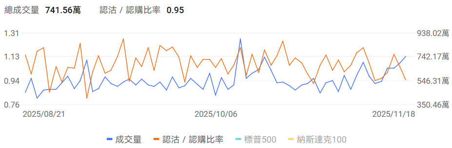 当前美股指数期权市场成交量略有上行,认沽/认购比例下行。