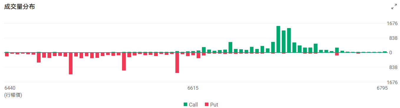 今日到期的 $标普500指数 (.SPX.US)$ 期权成交量分布:Call单与Put单分布存在分歧,Put单峰值在6500点,Call单峰值在6695点。