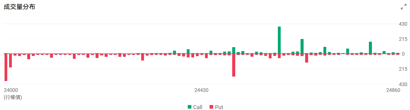 今日到期的 $纳斯达克100指数 (.NDX.US)$ 期权成交量分布:Call单峰值为24600,Put单峰值在24000点。
