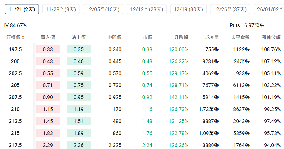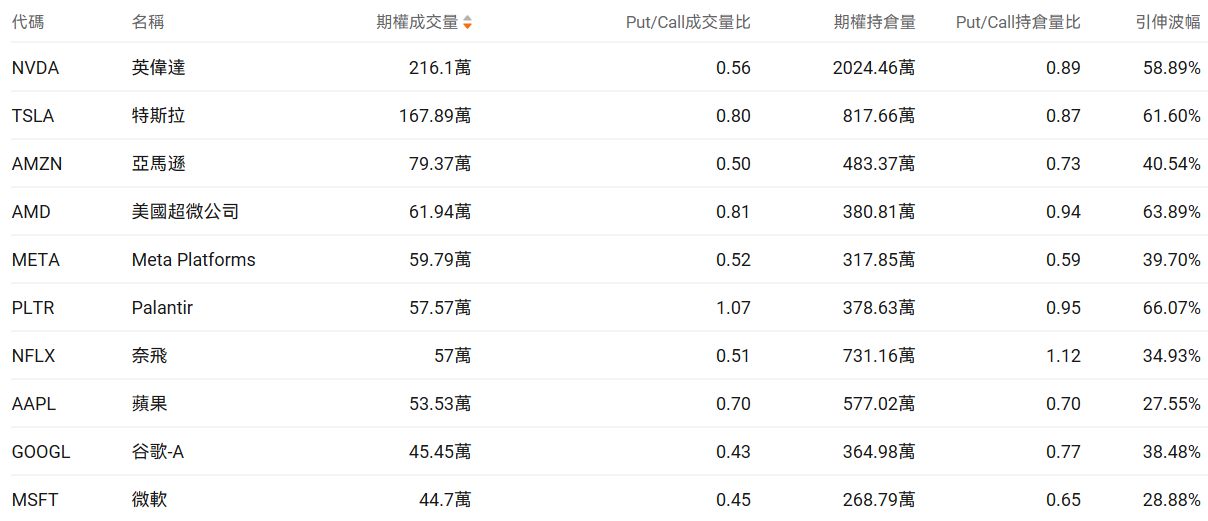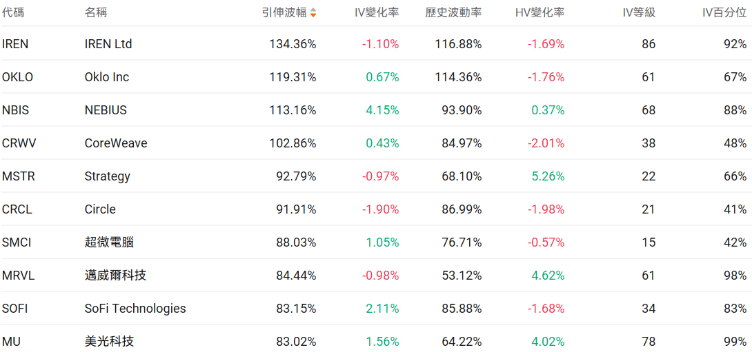 美股引申波动幅度排行榜前十(标的市值>100亿美元,且期权成交量>10万张)