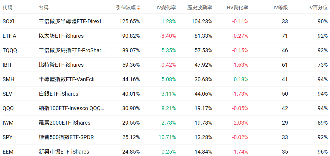 美股ETF引申波幅排行榜前十(标的要求:市值>100亿美元)