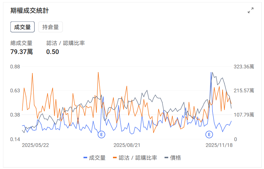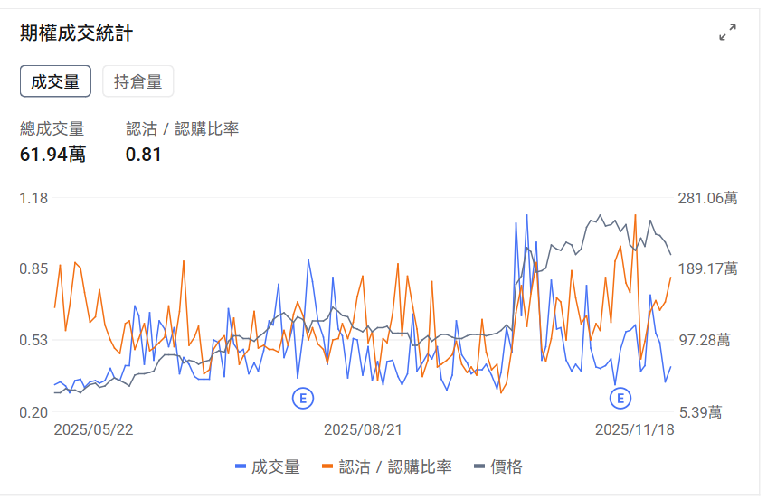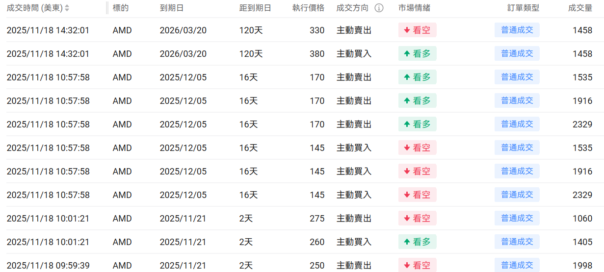 2、 $美国超微公司 (AMD.US)$ 上一交易日跌4.25%,前一日认沽/认购比例上行,成交量小幅度上行。