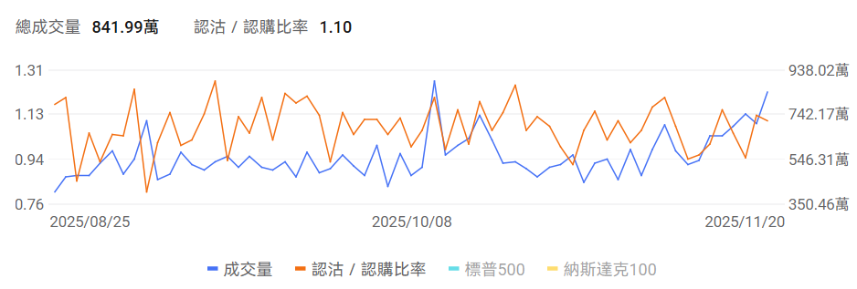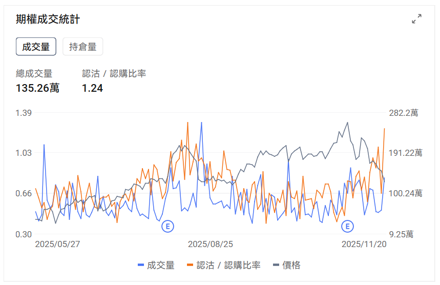 2、 $Palantir (PLTR.US)$ 上一交易日跌7.84%,前一日认沽/认购比例上行,成交量上行。