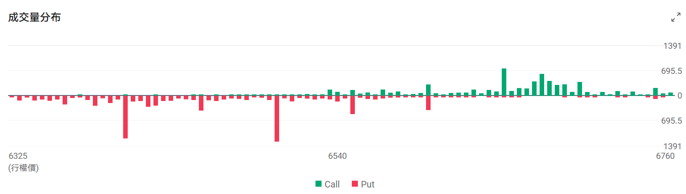 今日到期的 $标普500指数 (.SPX.US)$ 期权成交量分布:Call单与Put单分布存在分歧,Put单峰值在6500点,Call单峰值在6650点。