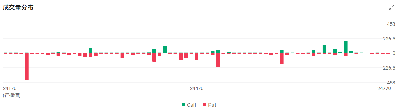 今日到期的 $纳斯达克100指数 (.NDX.US)$ 期权成交量分布:Call单峰值为24700,Put单峰值在24200点。