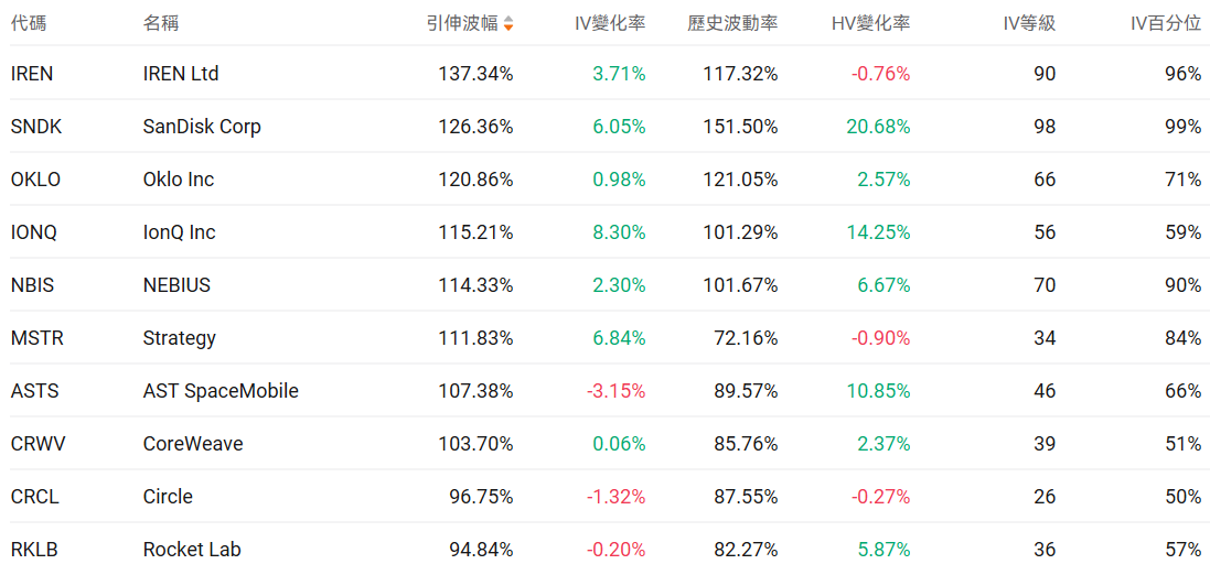 美股引申波动幅度排行榜前十(标的市值>100亿美元,且期权成交量>10万张)