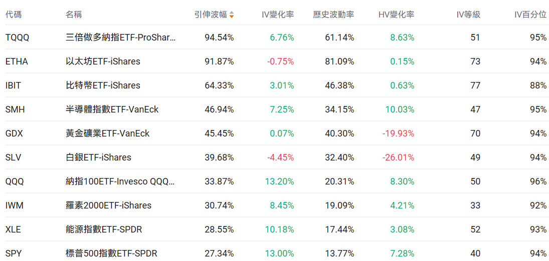 美股ETF引申波幅排行榜前十(标的要求:市值>100亿美元)