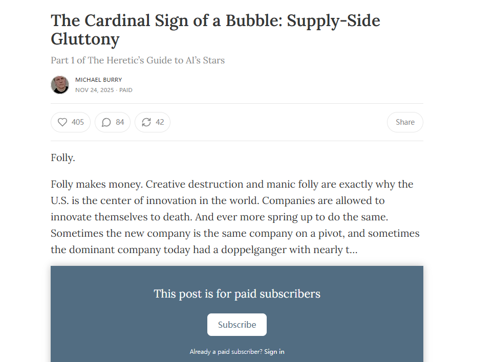 这一次,他并未如传言般通过巨额期权做空市场,而是选择通过首篇专栏文章《泡沫的主要迹象:供给侧的暴食》(The Cardinal Sign of a Bubble: Supply-Side Gluttony)来表达“做空AI”的观点。