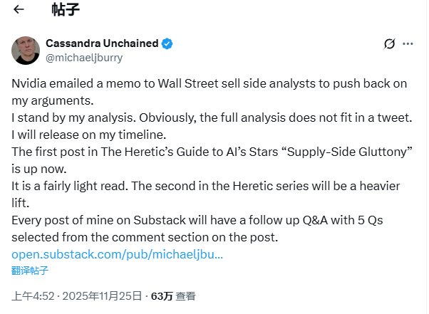 需要指出的是,尽管Burry此前被媒体误报持有“近10亿美元”的英伟达空单(实际上其名义价值仅为920万美元,且已平仓部分),但这并未改变他看空AI宏观逻辑的决心。