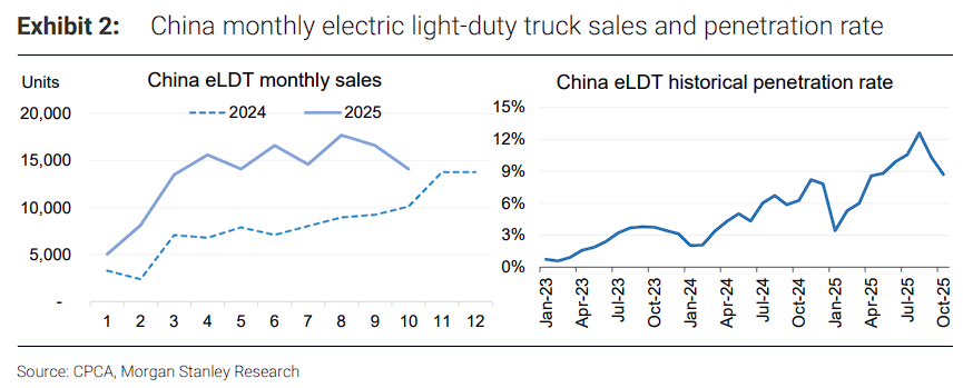如果说重卡是“先锋”,那么轻卡就是即将爆发的“主力军”。大摩表示,2025年10月,电动轻卡销量同比增长40%,而年初至今的累计销量同比增长则高达92%。