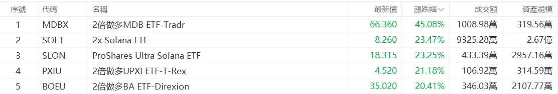 $2倍做多MDB ETF-Tradr (MDBX.US)$ 升45.08%,成交额1008.98万美元。