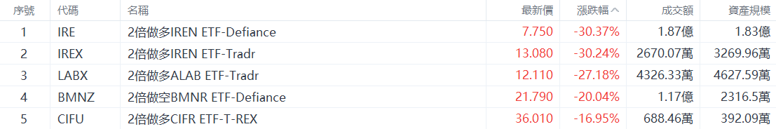 $2倍做多IREN ETF-Defiance (IRE.US)$ 跌30.37%,成交1.87亿美元。