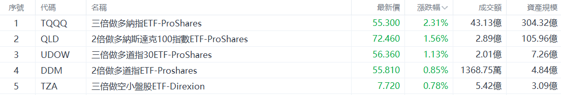 $2倍做多纳斯达克100指数ETF-ProShares (QLD.US)$ 升1.56%,成交额2.89亿美元。