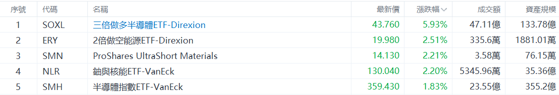 $三倍做多半导体ETF-Direxion (SOXL.US)$ 升5.93%,成交额47.11亿美元。